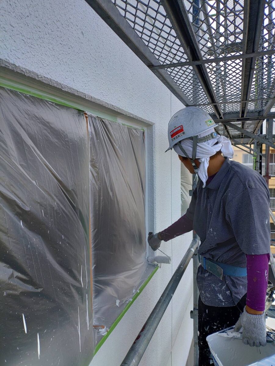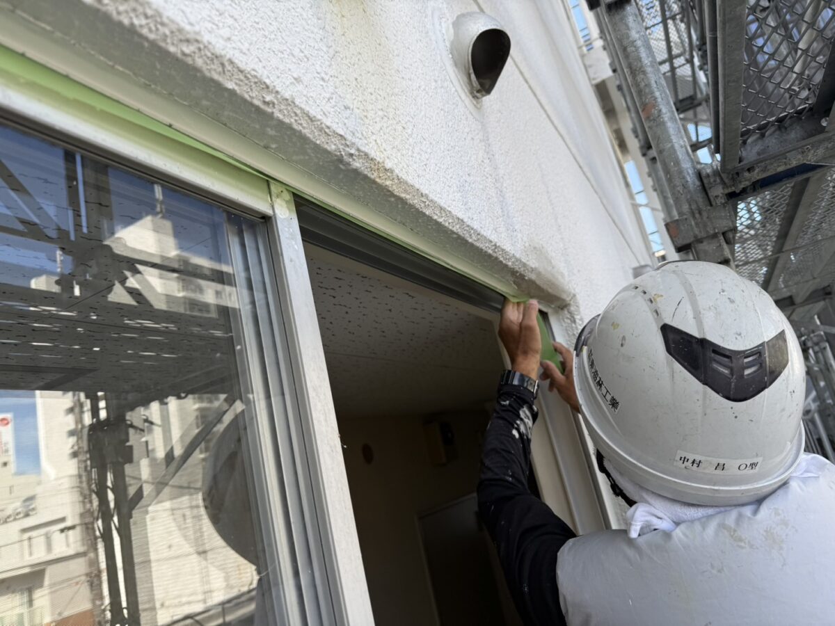 ここは共用の廊下の面でもあるのでしっかり養生し住人の皆様にご迷惑がかからないよう気を配ります。