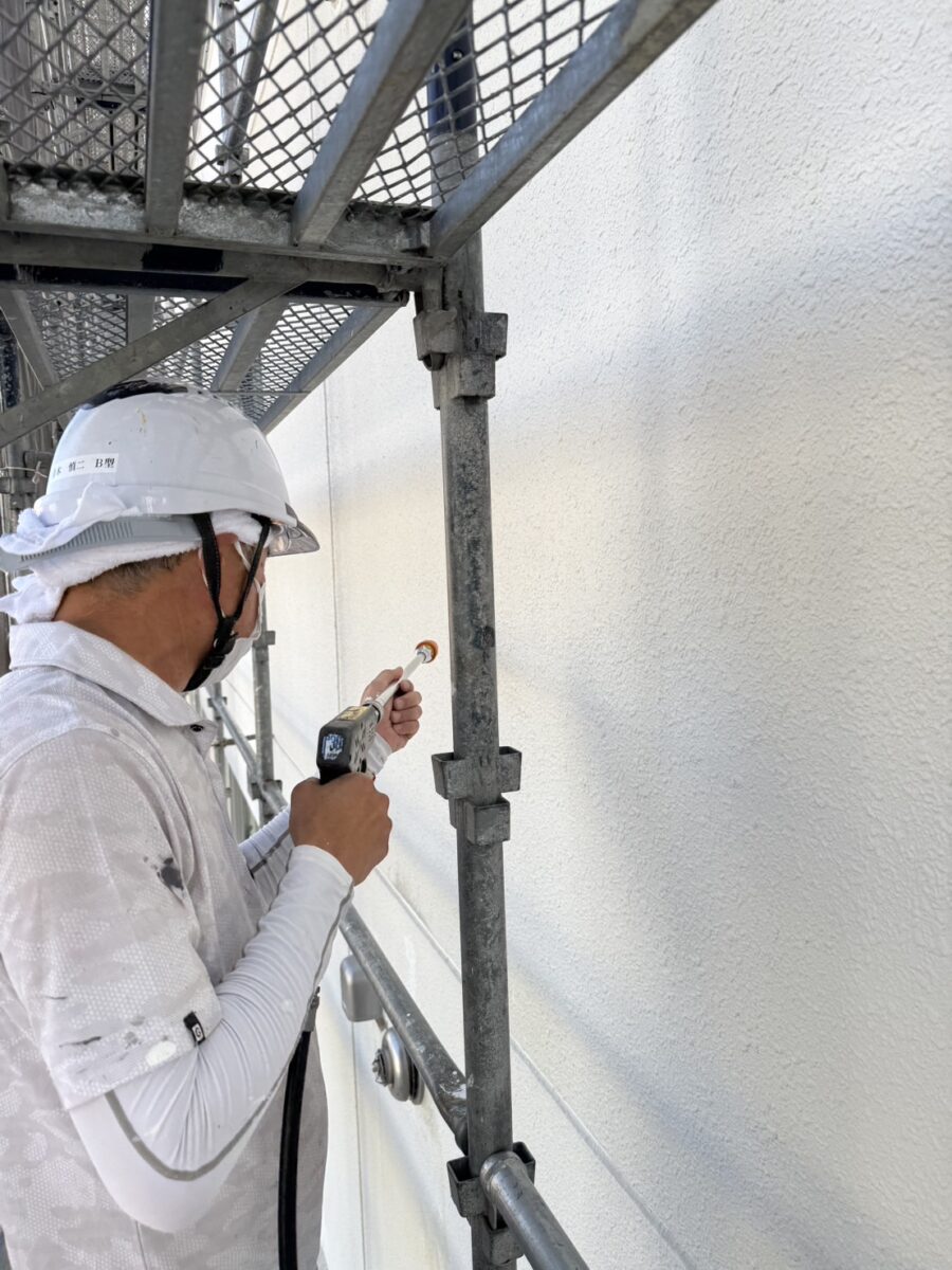 微弾性フィラーで下地を作ります。クラック等脆弱な部分はコーキング、左官で処理済なので