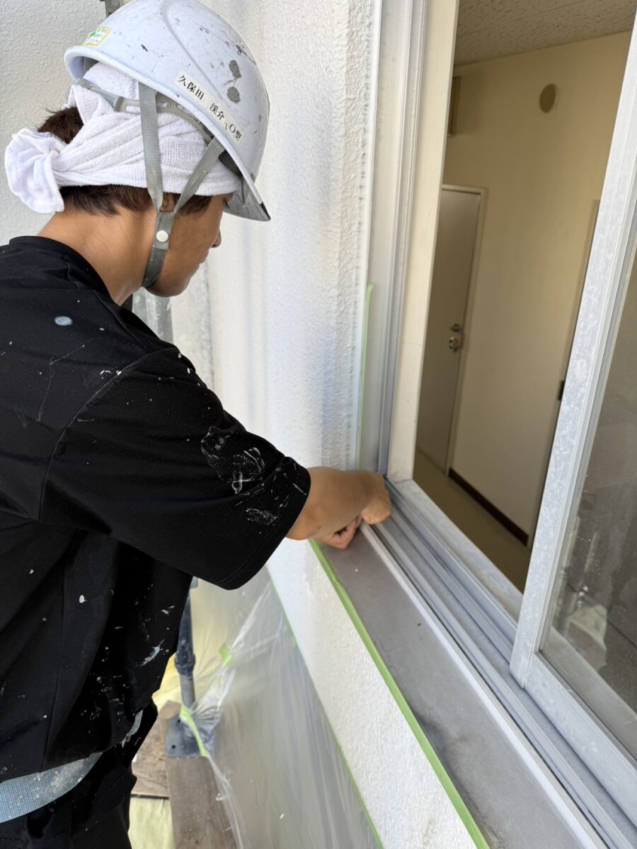 サッシ周りなどは長年のほこり等ついているので高圧洗浄のあとでないとテープがくっつきません。