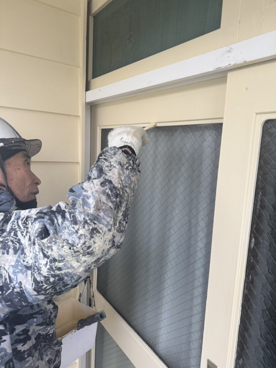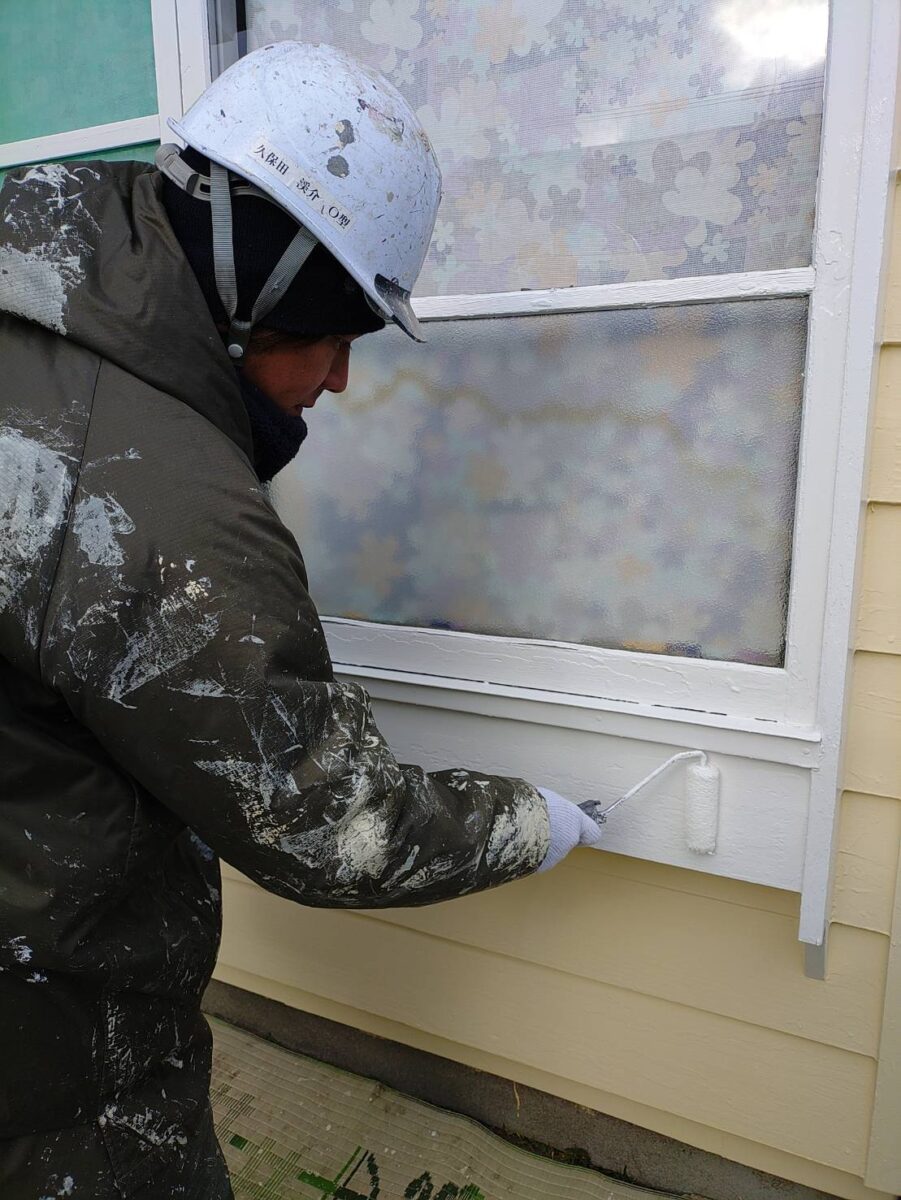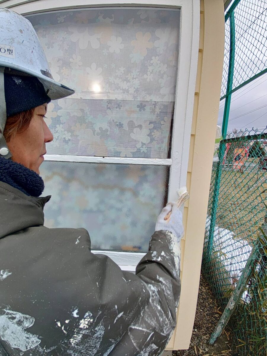 サッシ工事は秋口に終えていたのですが塗装の乗り込みは12月になってしまい、寒い中での作業ですが