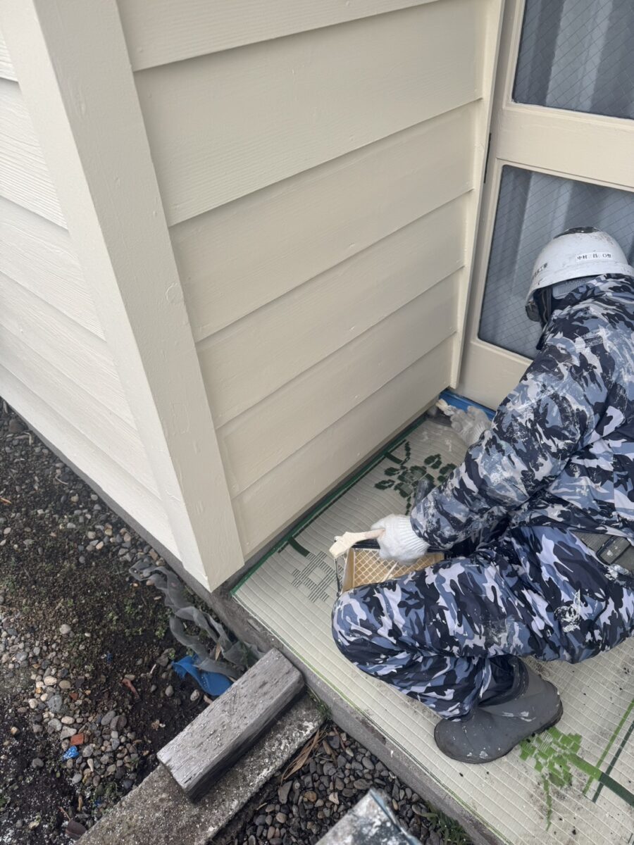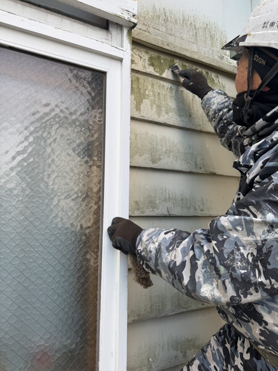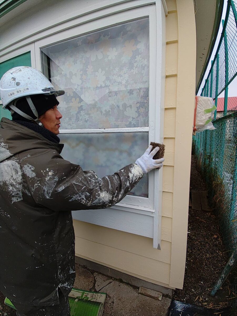 サッシ工事は秋口に終えていたのですが塗装の乗り込みは12月になってしまい、寒い中での作業ですが