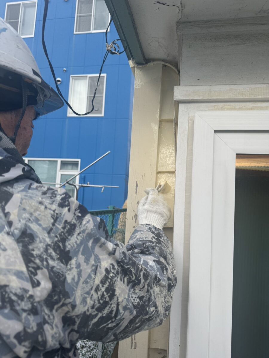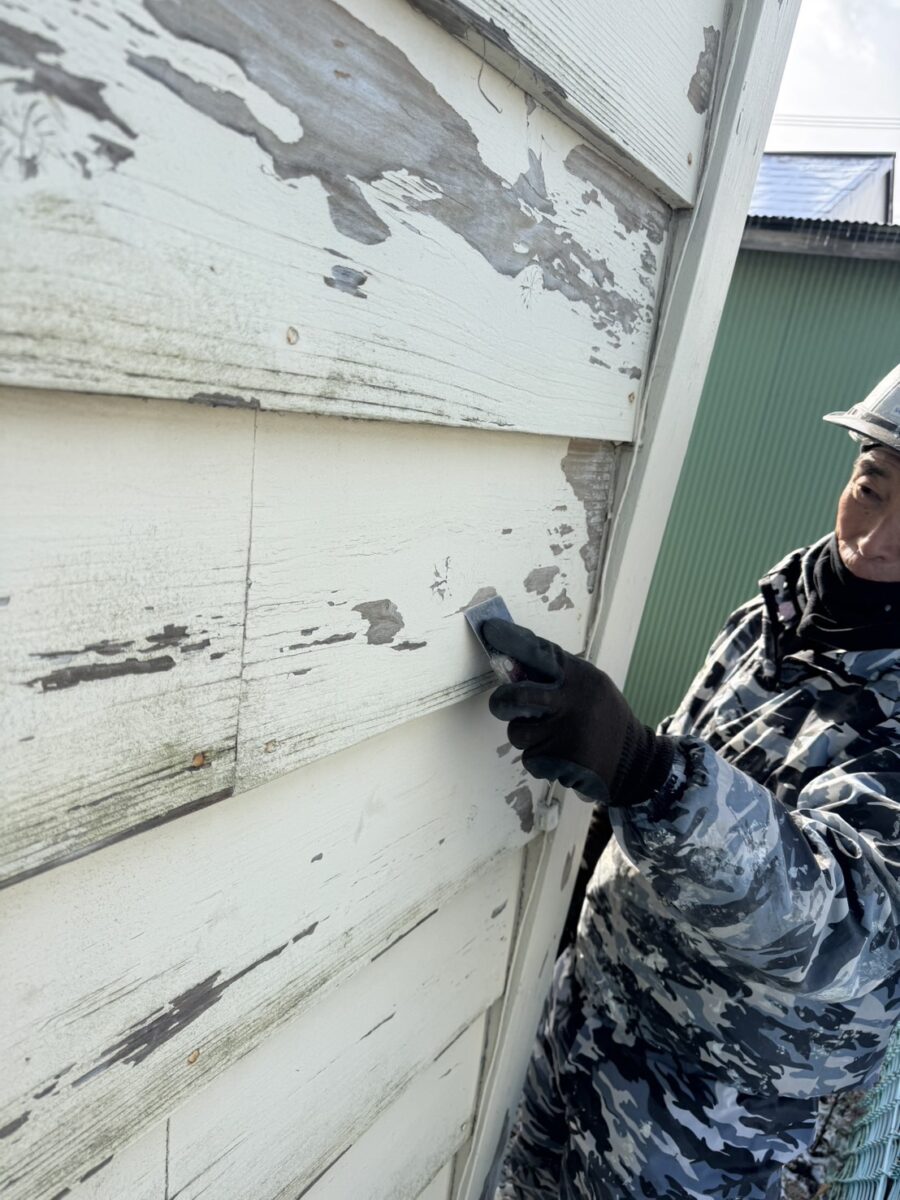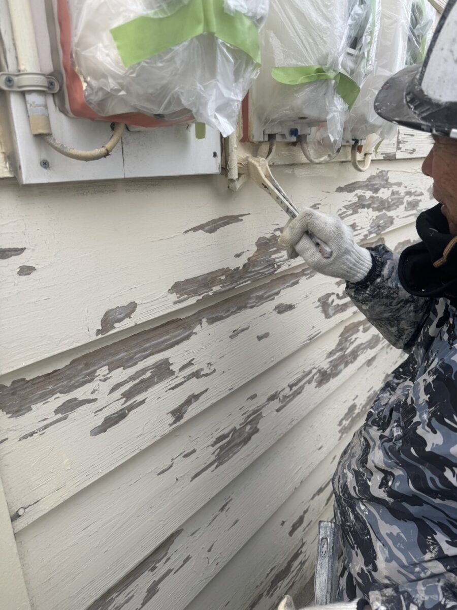 木なのでサンダーを掛けるわけにもいかずひたすら手ケレンで下地調整をしていきます。