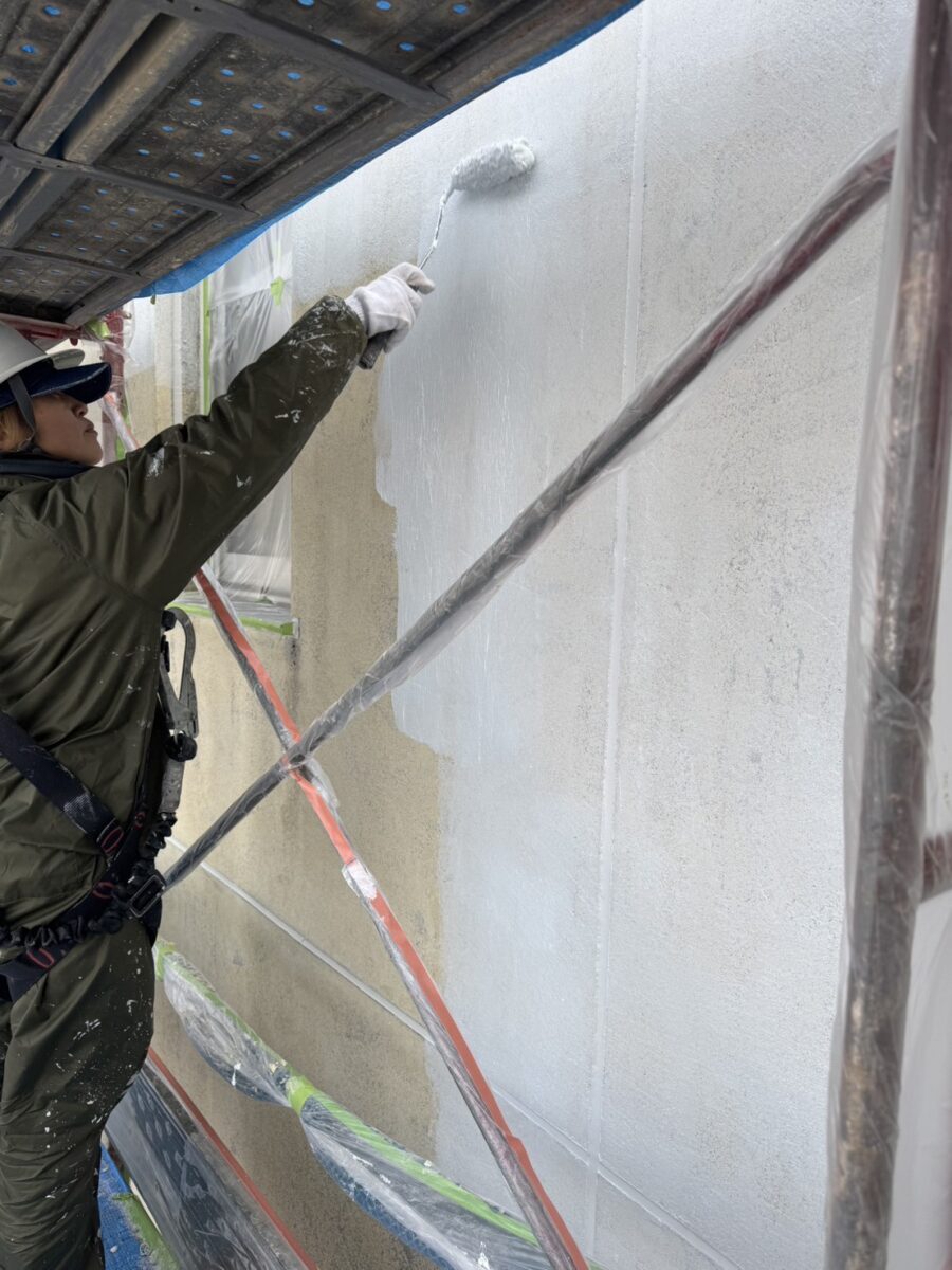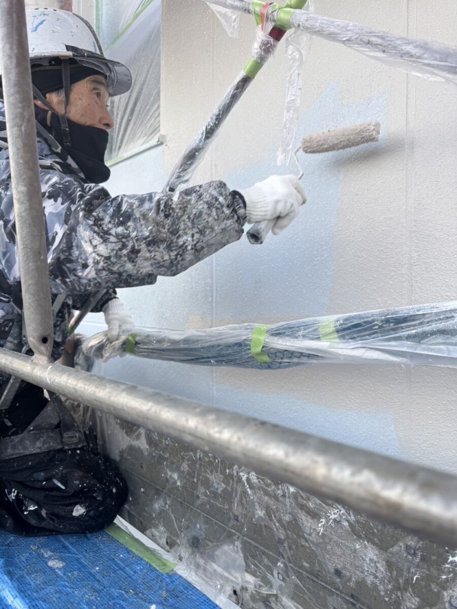 剥離、高圧洗浄が終わりシーラ-塗布で塗装がスタートです。