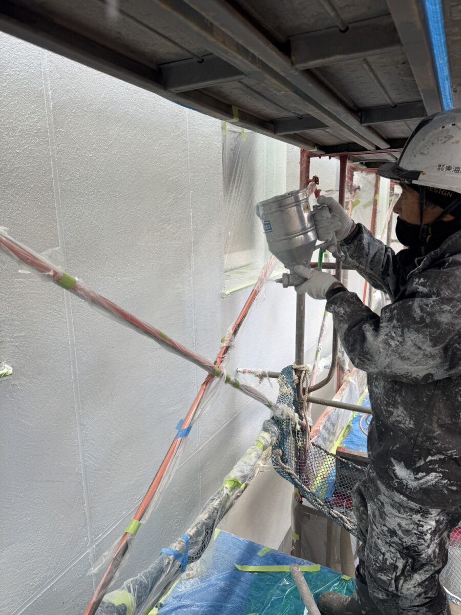 吹き付けタイルの仕様なのでまずはタイルベースを塗っていきます。